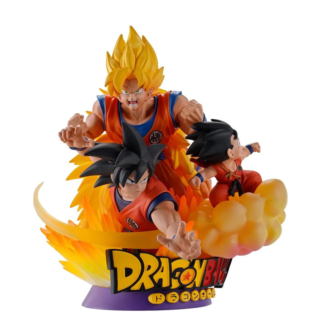 Sitting at approx. 5 inches tall, this petite diorama features Goku, from the Dragon Ball Z, in various forms though out the years! From Kid Goku flying on the Nimbus cloud, to Super Saiyan 3 form.