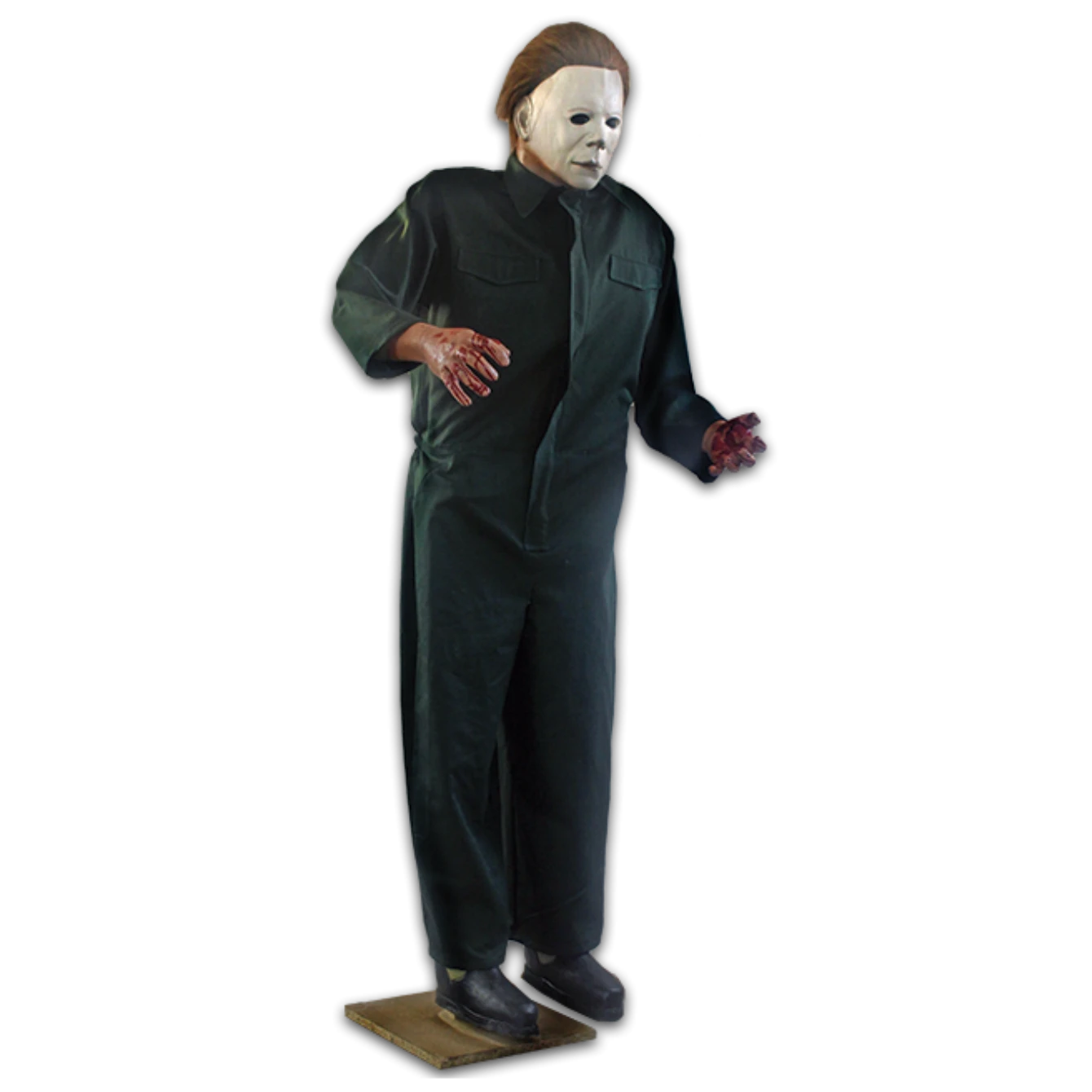 , our Officially Licensed Halloween II Coveralls, a wood base for balanced standing and posable arms.