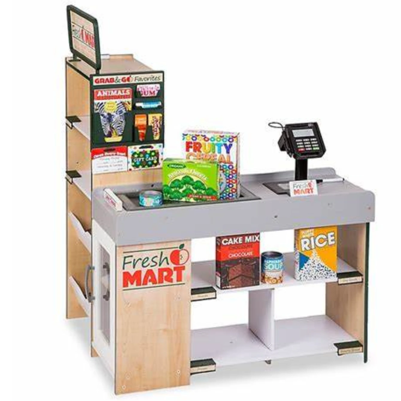 Free-standing sturdy wooden grocery store for playful shopping