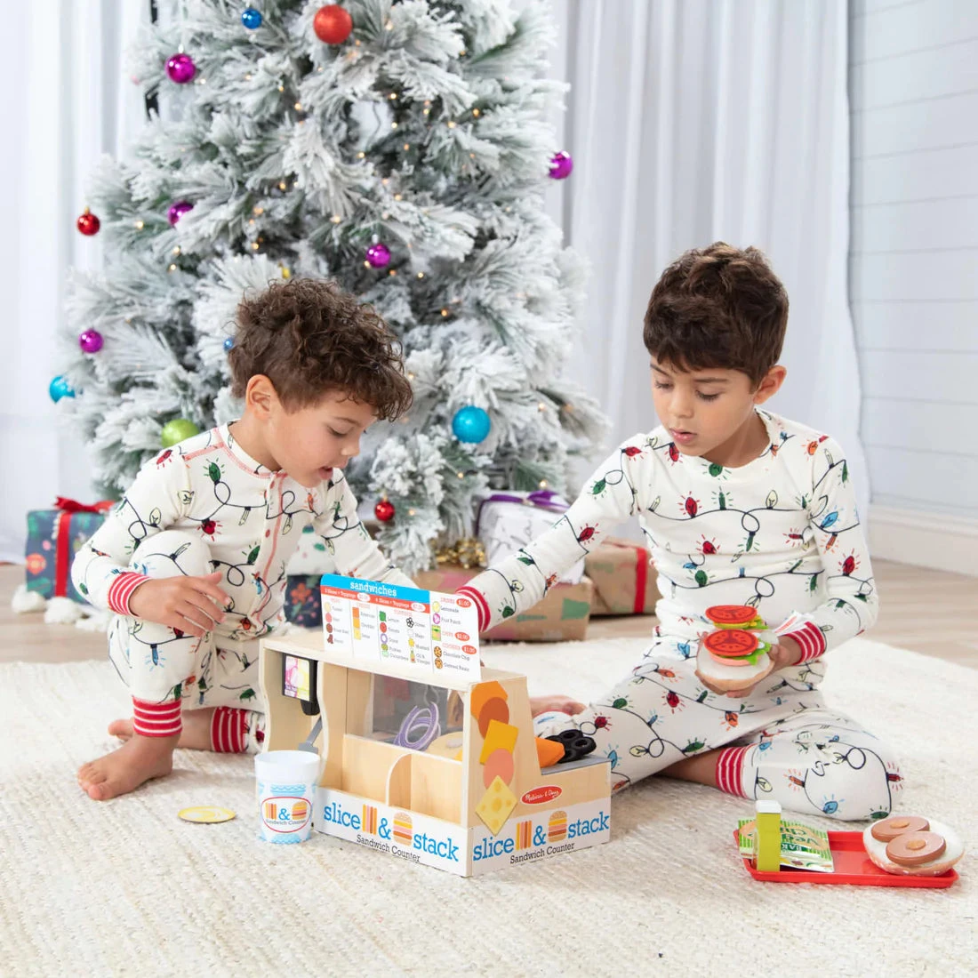 Create piled-high sandwiches, made to order with this wooden sandwich counter play set with all the fixin’s! The sturdy wooden deli counter includes a play meat and cheese slicer for the wooden play food, and felt sandwich roll and toppings to create sandwiches ordered from the menu. There is a wooden dressing bottle, play snacks, and a cup with drink insert to round out meals that customers can pay for with the included play money! An illustrated guide helps with sandwich prep and shows kids how to use the slicer. All 52 pieces store in the sandwich counter for easy cleanup. It’s a deliciously fun way to encourage counting, sorting, and fine motor skills, as well as imaginative play and storytelling.