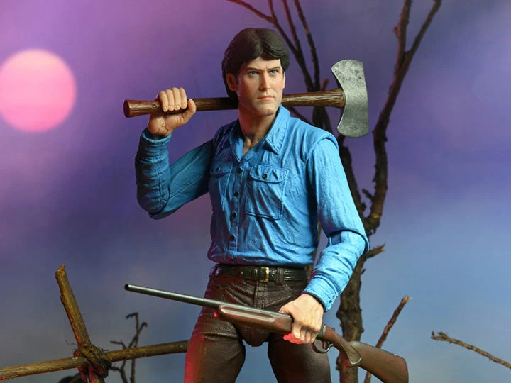 Celebrating the 40th anniversary of the iconic cult classic movie The Evil Dead, NECA is excited to release a special Ultimate Ash 7” scale action figure! Ash features the likeness of the one and only Bruce Campbell, and comes with three interchangeable heads, chainsaw, axe, shotgun, lantern, tape player, and more!