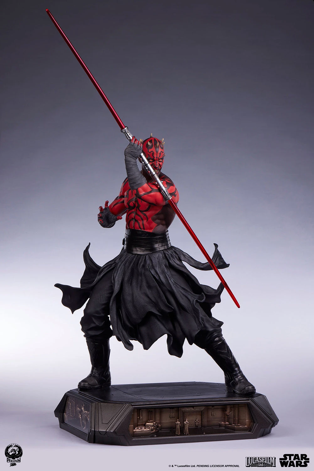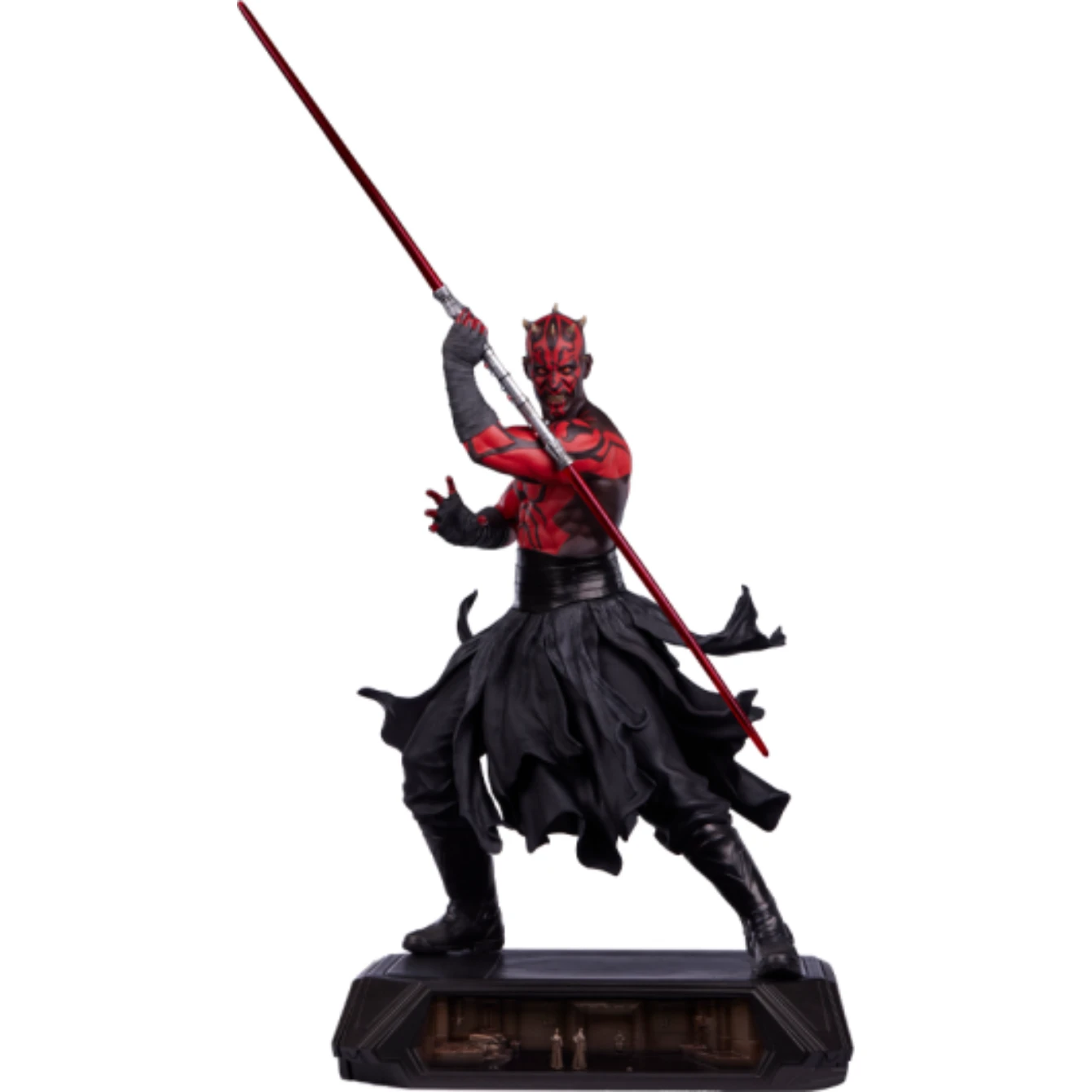 The Darth Maul 1:3 statue stands atop a pedestal style base decorated with four unique relief scenes with dramatic overhead LED lighting, each depicting important scenes from the classic STAR WARS: EPISODE I – THE PHANTOM MENACE.