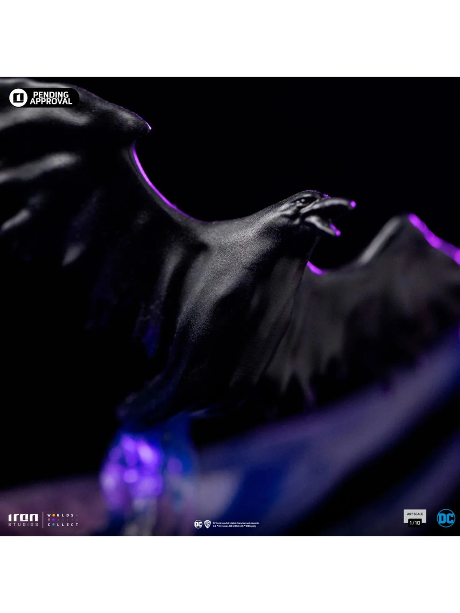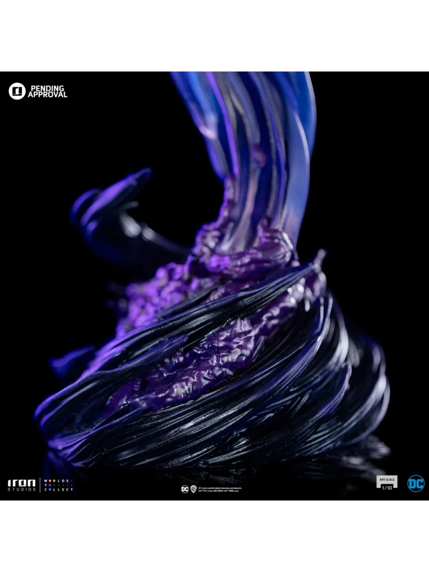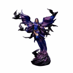 Above a vortex of dark purple energy made of condensed spirits from another dimension, the titan hero fuses her body to the energy, which takes the shape of a long cape connected to her body and opening like big wings, from which black ravens appear flying, like spells cast by her with open arms. Bringing an extra interchangeable head, without the hood, totally revealing her beautiful face, but with her stern and ominous countenance, chosen by fans and collectors, Iron Studios bring the statue “Raven – DC Comics series #8 – Art Scale 1/10”, the mystic and powerful half-human/half-demon hero, founding member of the group of heroes known as the New Teen Titans.