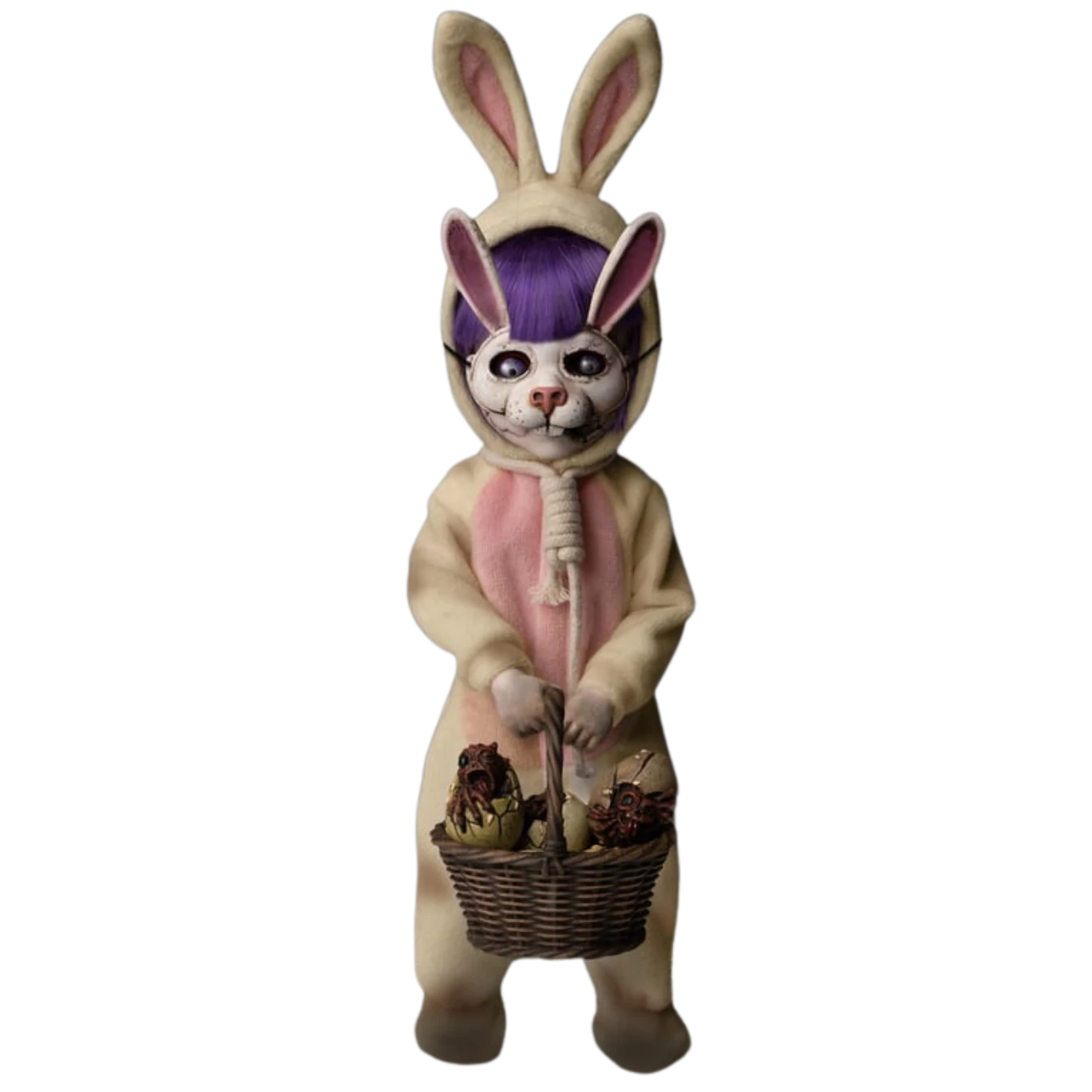 Dressed in her infamous, weathered bunny costume with a noose around her neck and removable bunny mask, Eggzorcist hops straight into your nightmares! She’s gone rotten – switch out her “Death Mask” face plate from a soul-piercing stare to a decaying, ghostly grin! Her glass-like eyes can move by way of controls inside her head.