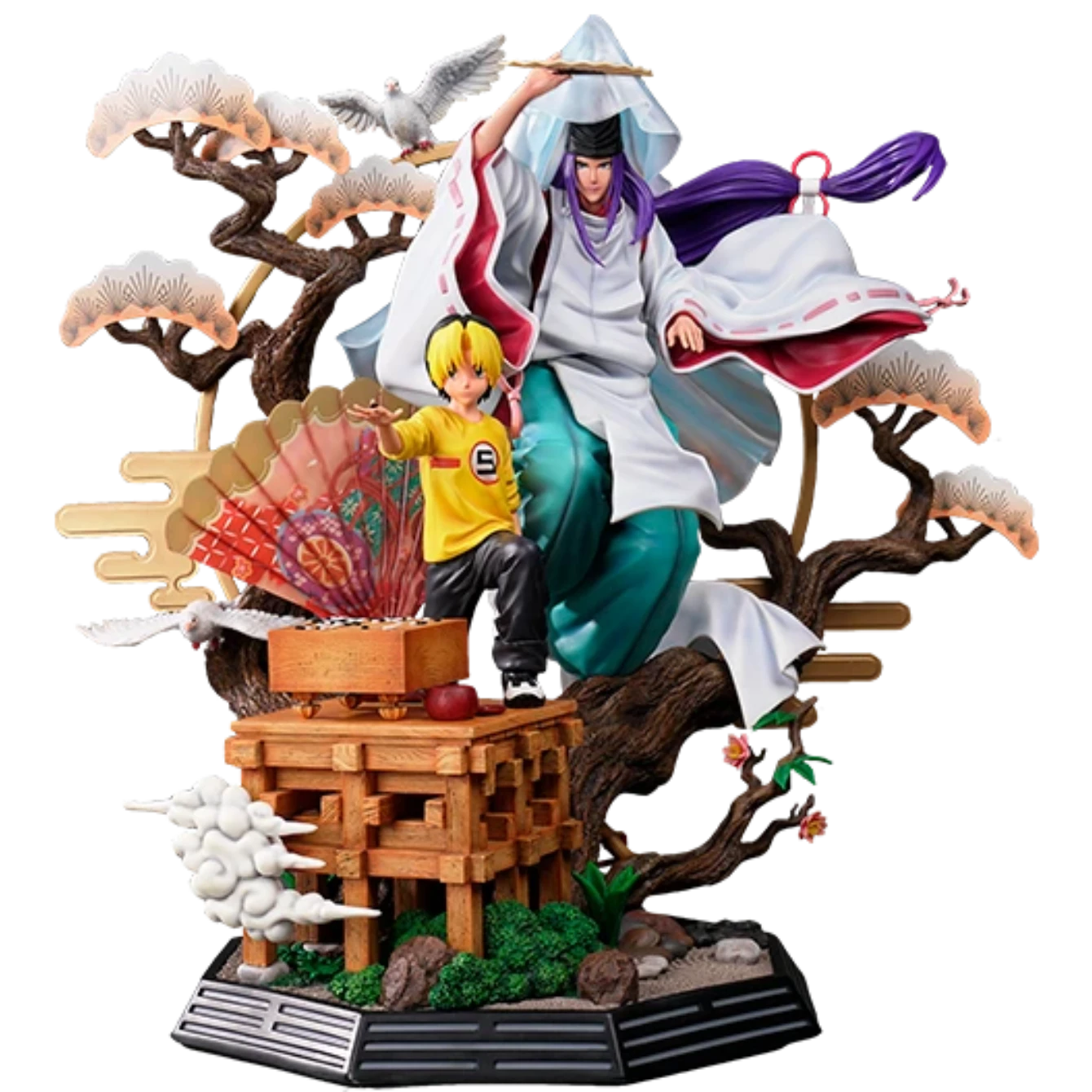 This Hikaru no Go statue measures 20.4 inches tall and features the highly detailed and sculpted characters Shindou Hikaru and Fujiwara no Sai: Hikaru with short black hair and golden fringes, and wearing a yellow T-shirt with the numeral “5”, while Sai is featured in his iconic white hunting clothes and holding a bat fan in the right hand. A sun wheel, a sturdy cypress, a big Japanese fan, and two flying birds form a stunning backdrop. The base beneath them is full of details, such as Eight Diagrams symbols, realistic sand-like textures, sculpted grasses, and cobbles. The wood-like go board sits on the base, and each go stone can be placed on the board, adding a sense of reality to the statue.