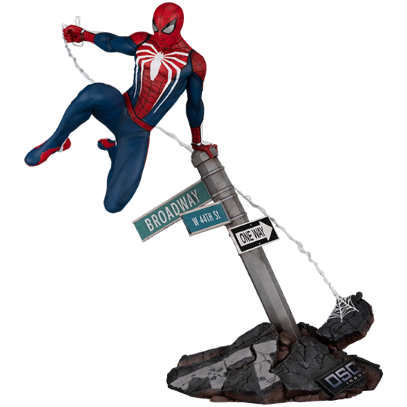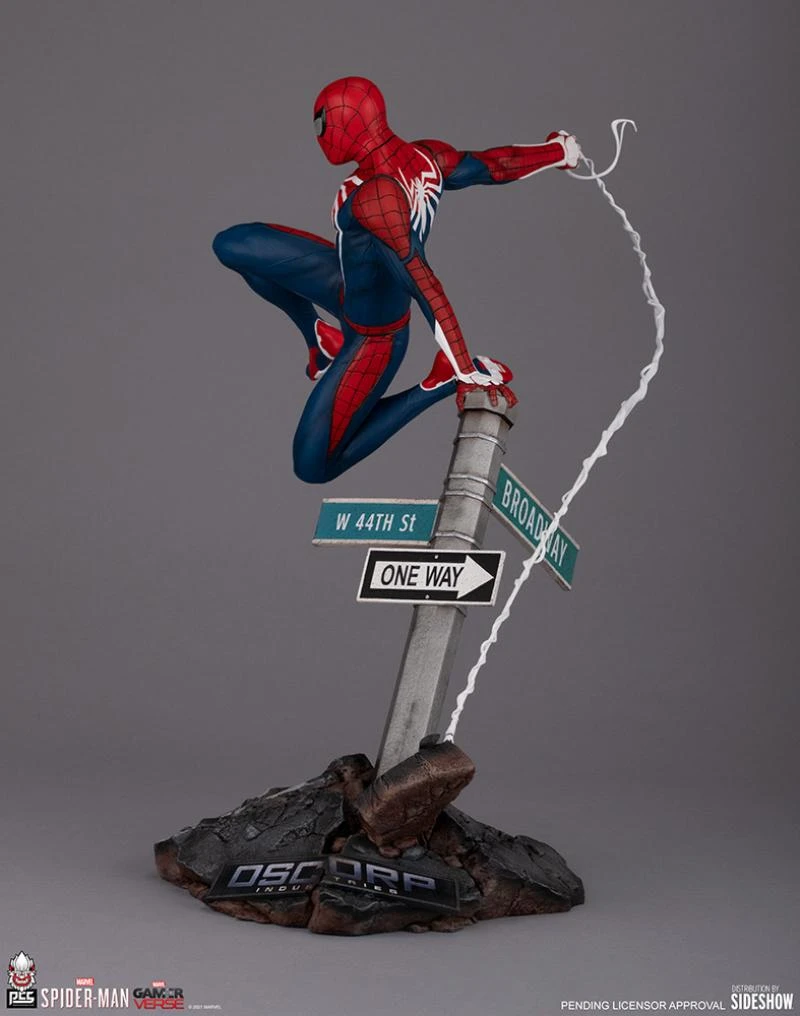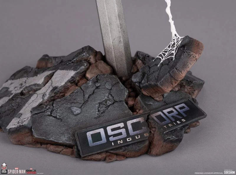 Inspired by the hit video game Marvel’s Spider-Man, the Spider-Man: Advanced Suit 1:6 Scale Diorama measures 14” tall and 13” wide as the friendly neighborhood hero leaps into battle on a street sign base. Partly buried in rubble, the city fixture features the intersection of Broadway and W 44 St on its green signage while a partially destroyed Oscorp Industries logo can be seen in the debris below.