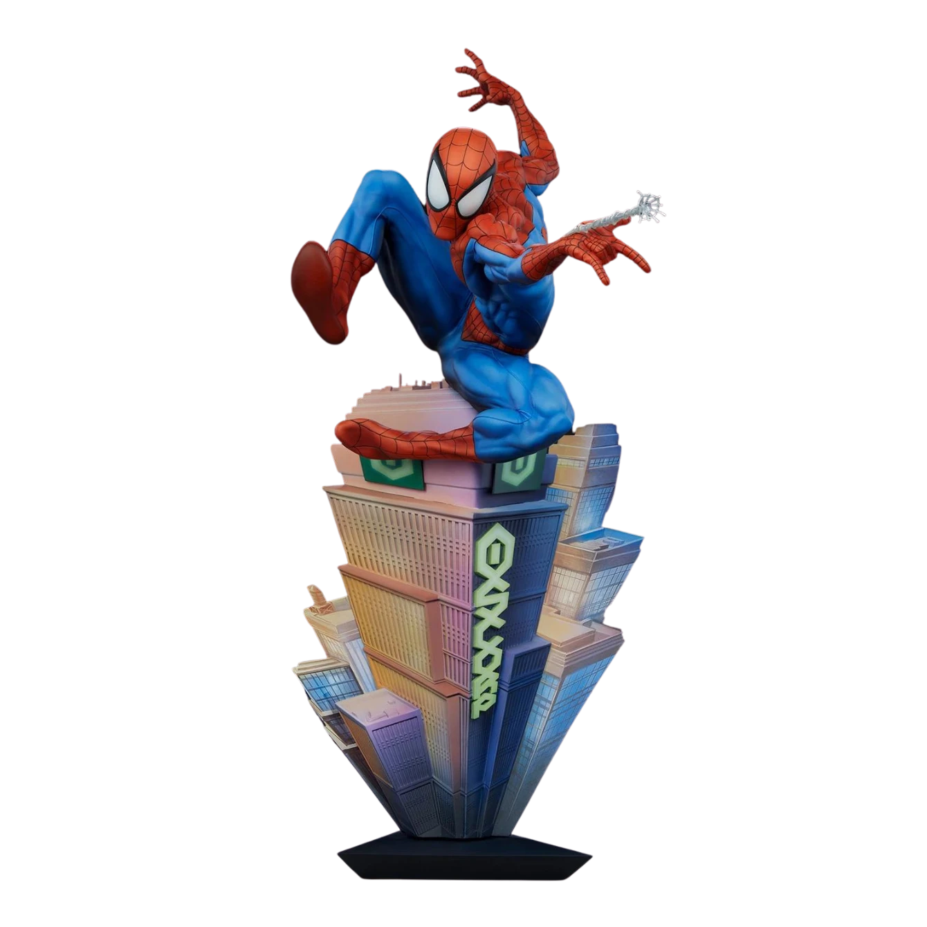 The Spider-Man Premium Format Figure measures 21” tall and brings the friendly neighborhood right to your home! A unique forced-perspective base captures the heights and sights of the New York City skyline as Peter Parker swings off on his next crimefighting adventure. The Oscorp building looms large beneath him, and the base is detailed from every angle to give depth and detail to the environment. Theatrical paint application recreates sunlight and shadows, making it another beautiful day in the Big Apple for everyone’s favorite wall-crawler.
