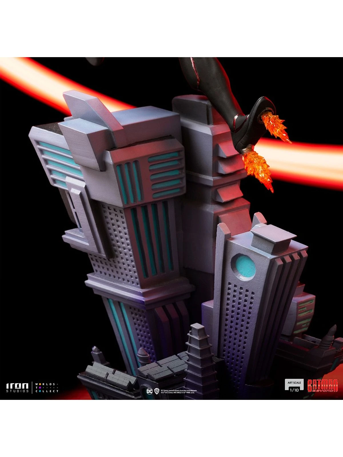 Over a base formed by imposing buildings with sinuous angles, emulating the dystopic futuristic megalopolis Neo-Gotham, its dark knight protector floats propelled by the flames from his boosters on his feet, nimbly directing his flight with his gliding bat wings spread beneath his arms. Using a high technology costume that, besides allowing him to fly, also gives him superhuman strength, agility, and endurance, adding to his guidance and training with his predecessor and mentor, the new Dark Knight wages his own crusade against evil, facing his own archenemies rogues gallery. Iron Studios proudly present their statue “Batman Beyond – DC Comics Series #8 – Art Scale 1/10”, with the futuristic version of the hero created by Bruce Timm, Paul Dini, and Alan Burnett in the iconic animated series created by The WB Television Network in 1999.