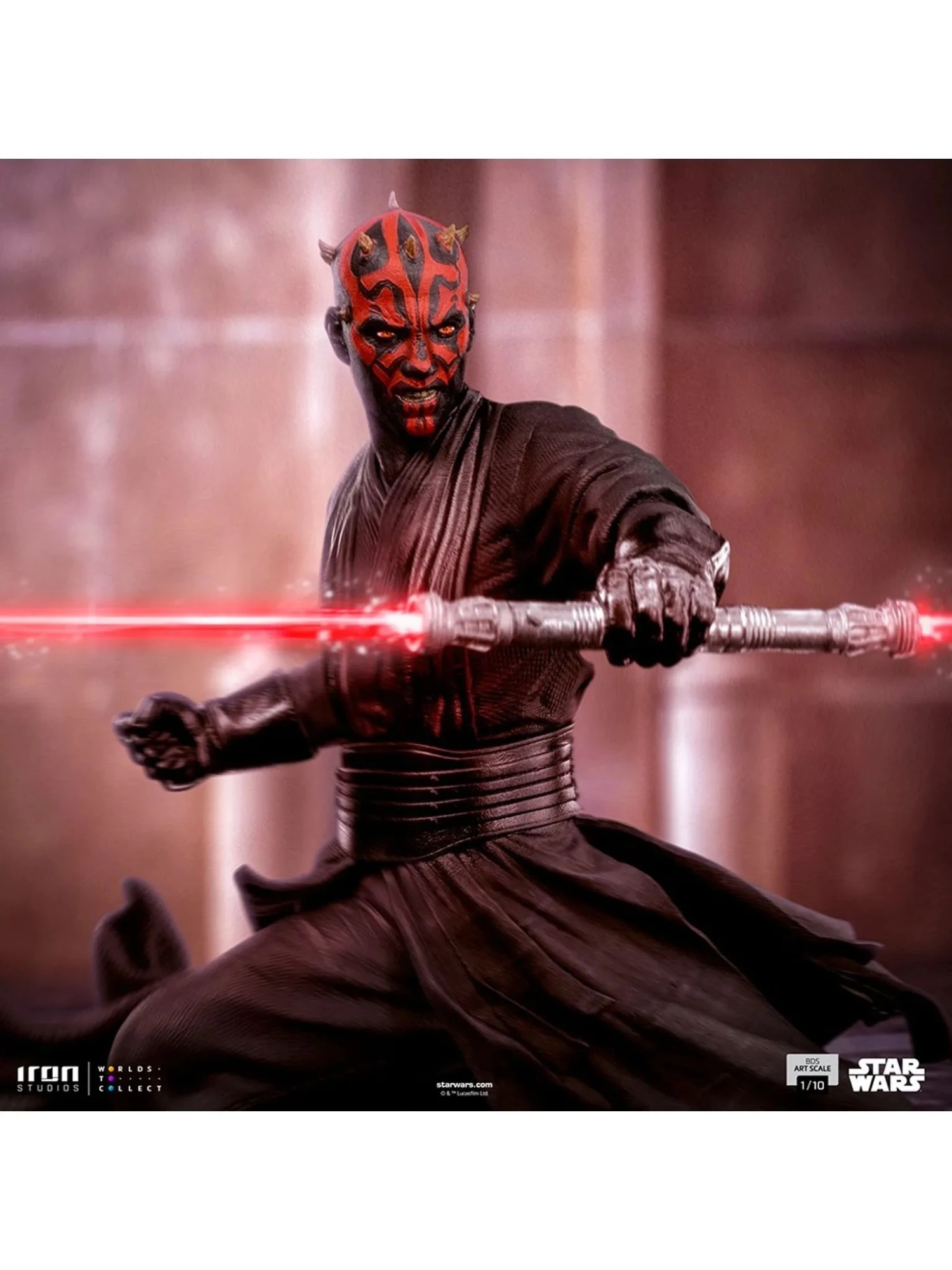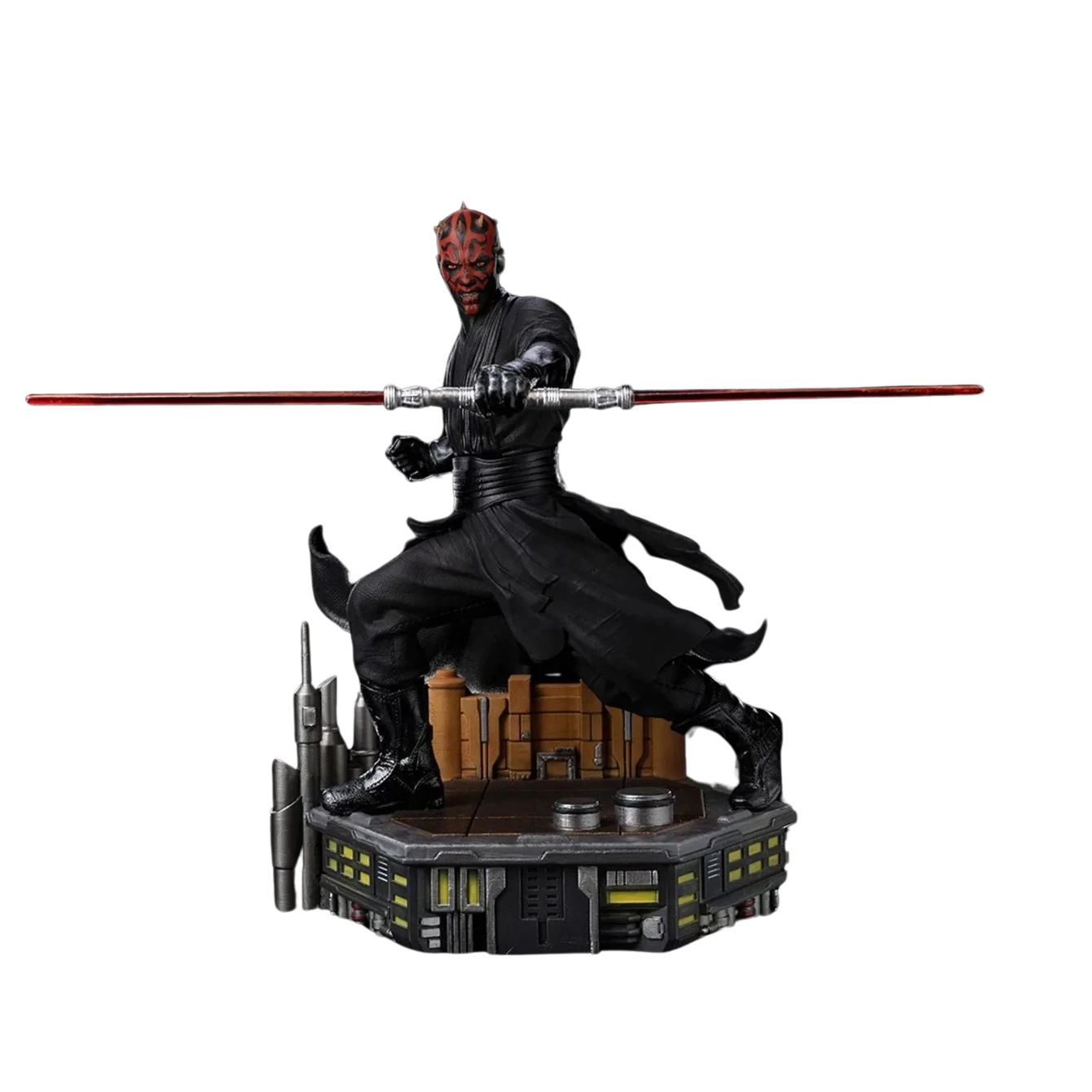 In the Palace of Theed on planet Naboo, the dark Dathomirian Sith warrior with all his skills uses Form VII, also known as Juyo, described as the cruelest combat form with a lightsaber. Adding his knowledge and discipline as a master in Teräs Käsi, a deadly and mystic martial art known in the whole galaxy for its lethality, he became one of the most efficient and lethal assassins among the Sith Lords. Inspired by the iconic dueling scene from Star Wars: Episode I – The Phantom Menace, where he faces the Jedi master Qui-Gon Jinn and his Padawan apprentice Obi-Wan Kenobi with his double-bladed lightsaber, Iron Studios, now with their global license, present the statue “Darth Maul BDS – Star Wars – Art Scale 1/10”. Over a detailed diorama pedestal that refers to the technological scenery of the power plant in Naboo, his expressive facial features gnashing his teeth in fury, all the movement from his pose and textures in his suit are perfectly portrayed in this fantastic figure, that undoubtedly brings immediately to the mind of all the fans the music track Duel of the Fates by composer John Williams.
